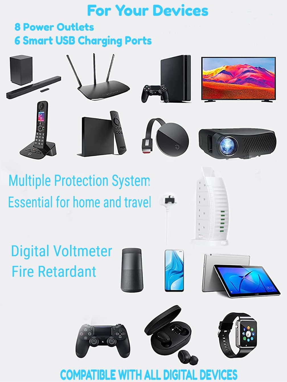 ✔ 6 USB Ports + 8 AC Outlets (label) – Powers multiple devices at once, ideal for smartphones, laptops, printers, and more.