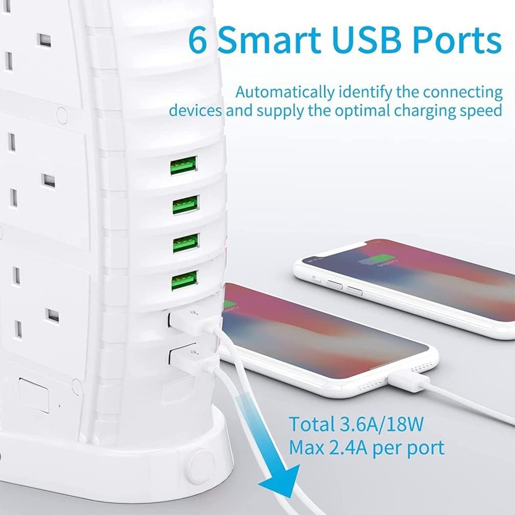 POWERMAX Tower Extension – 6 USB Ports & 8 AC Outlets – A high-capacity charging hub designed for homes and offices, offering surge protection, USB fast charging, and vertical space-saving design.