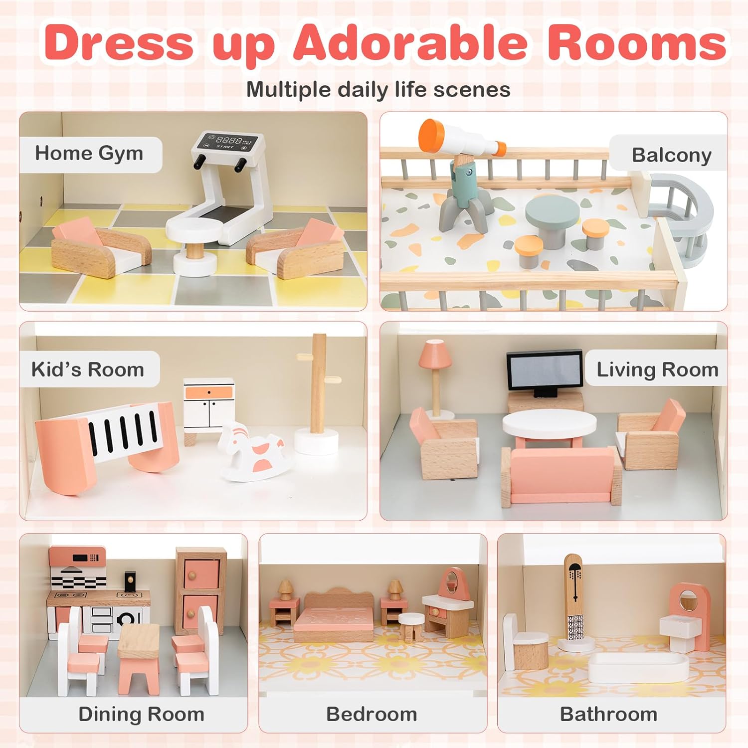 – Nine distinct rooms across three levels, including rooftop balconies and wide staircases for fluid doll traffic. -